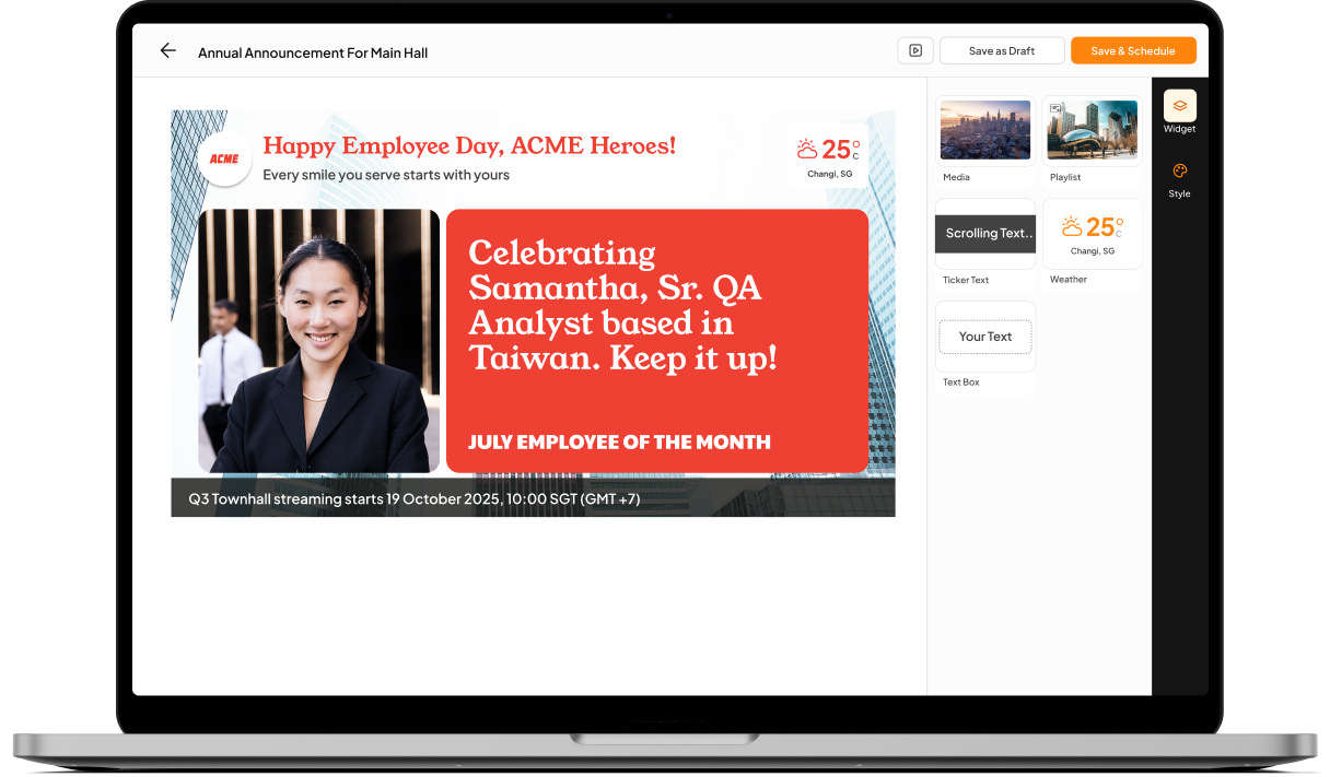 Athena Signage is built for every team that wants communication to feel alive. From important announcements to daily updates, it keeps everyone connected and engaged.