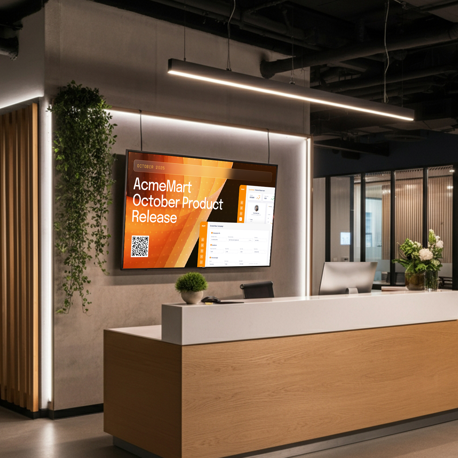 - Corporate Offices: Smart noticeboards display company news, events, and important announcements. Meeting-room schedules prevent double bookings and help staff plan efficiently. KPI dashboards show live performance metrics to keep teams on track. Visitor welcome screens create a professional and welcoming first impression for guests.